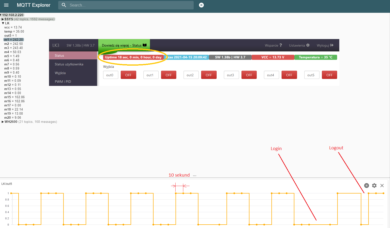 (03-25-2021, 12:23 PM)wilkxt napisał(a): Załączam nowy soft v1.38b Zauważyłem ostatnio, że przy tej wersji software'u LK resetuje się przy logowaniu i wylogowywaniu z panelu (tak to przynajmniej wygląda). Wcześniej nie zwróciłem na to uwagi ale po dyskusji o możliwości dodania UpTime do elementów wysyłanych przez mqtt próbowałem się temu przyjrzeć i wyszło mi, że zawsze po logowaniu UpTime jest bardzo krótki (kilkadziesiąt sekund). Obserwując przebieg na wyjściu OUT5 (prostokąt o okresie 1 minuty) zauważyłem, że w momentach logowania i wylogowywania ulega o zaburzeniom. Szczegóły na dołączonym rysunku.