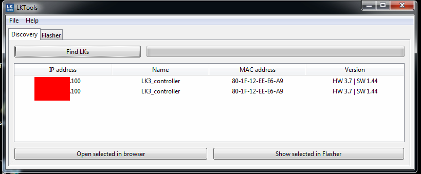 LKTool wykrył dwa razy ten sam sterownik podając identyczne wartości IP i MAC