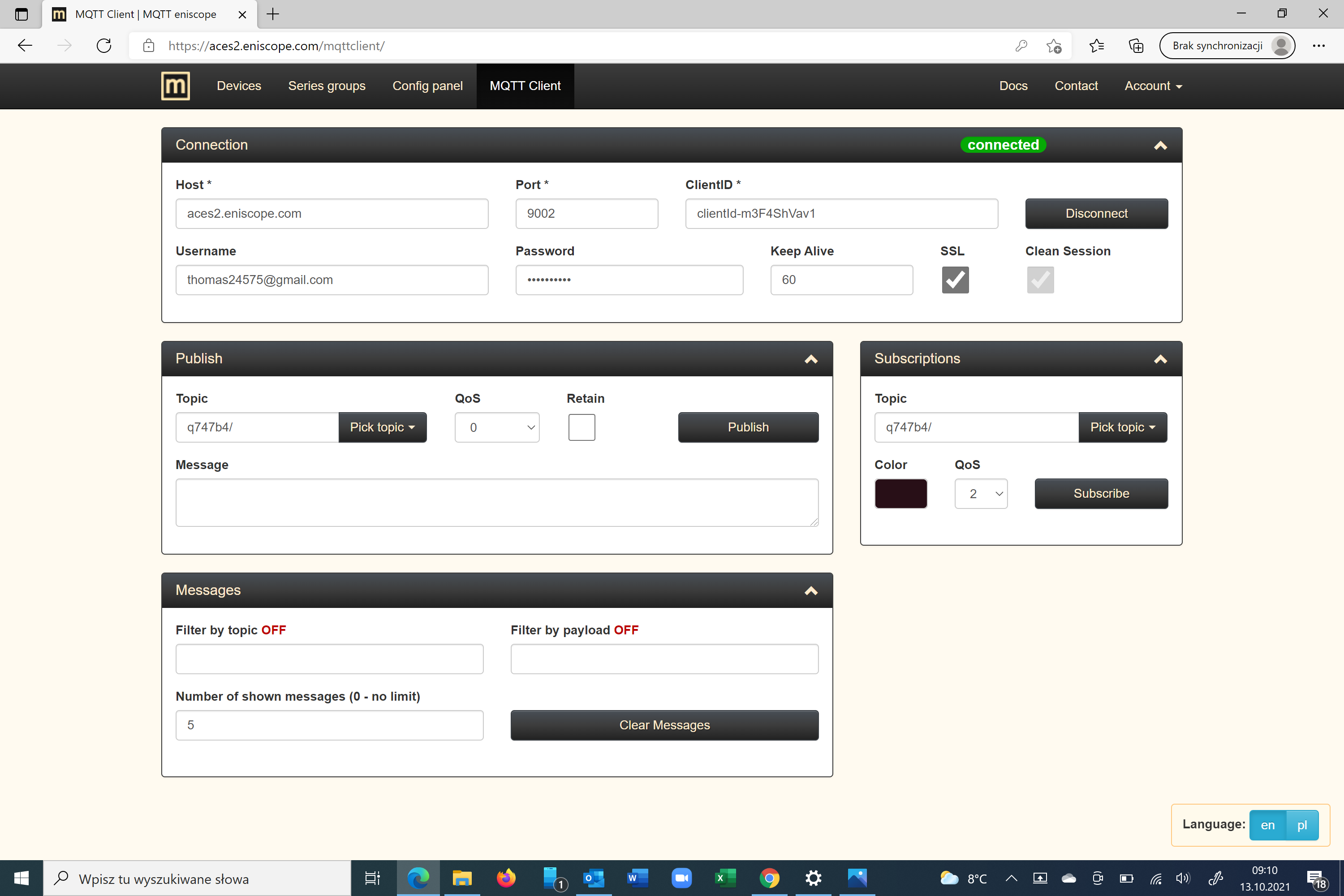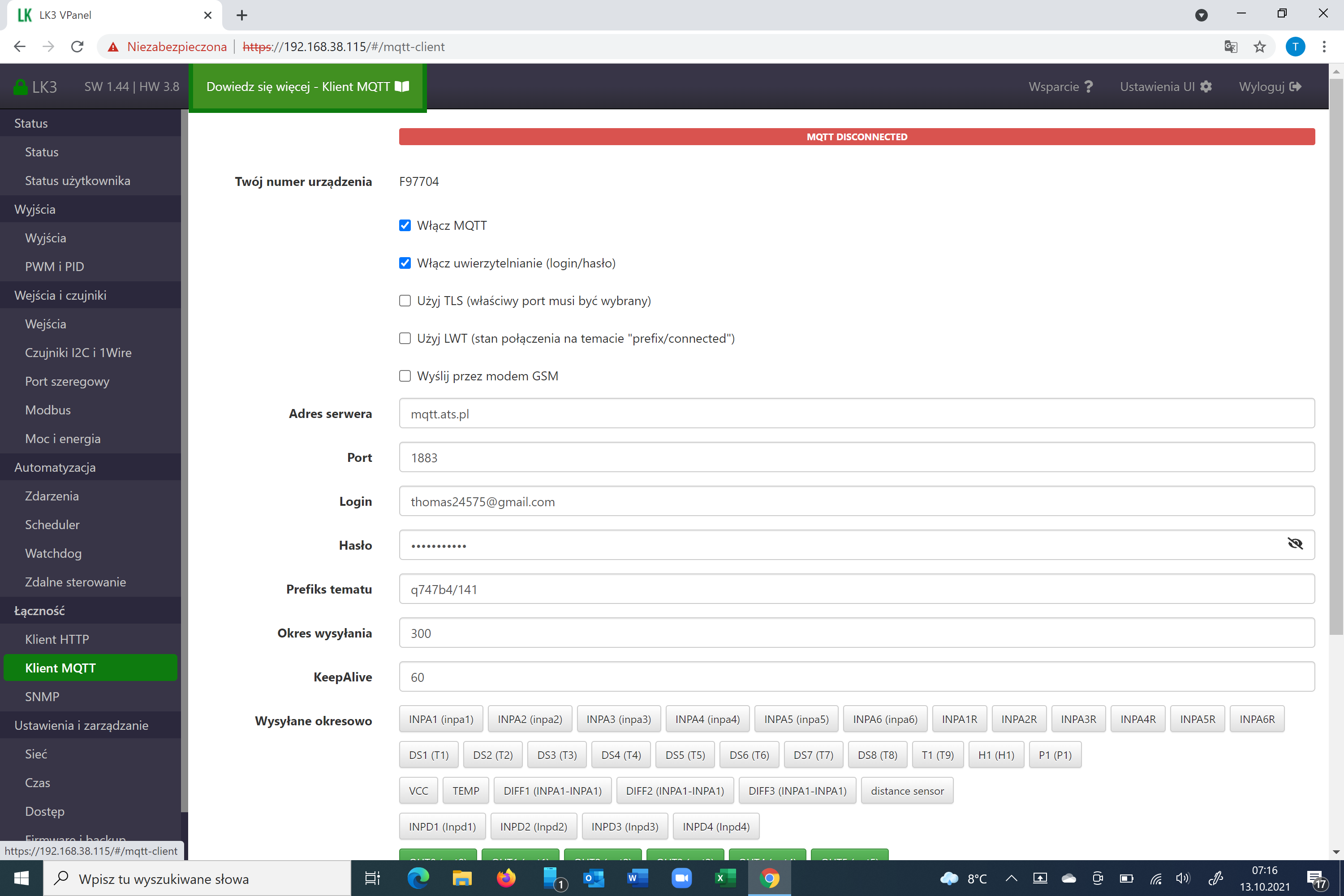 Ponadto nie mogę się połączyć z MQTT klient w LK pokazuje brak połączenia a MQTT klient na mqqt.ats.pl pokazuje że połączenie jest