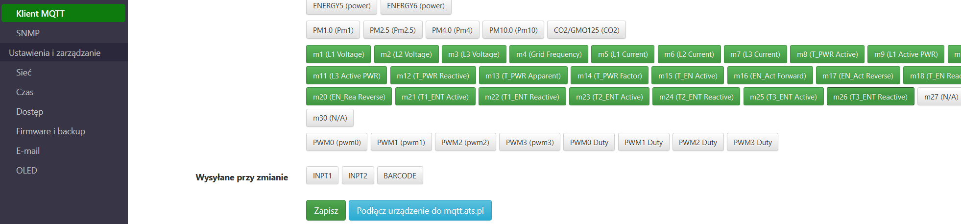 Po powrocie do strony ustawień MQTT są dalej nieaktywne, a dane im odpowiadające nie są wysyłane do brokera mqtt.